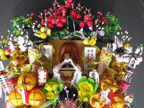 熊手飾りに用います各種小部品はクラフト部材としてお使い頂けます。 縁起物人形、お面、ピック、造花、青竹、俵、リボン、お札やちょうちん・・・ 紙製鯛や鶴など小さなサイズから大きなサイズまで取り揃えています。 民芸品アクセサリーの部材として趣味のクラフト部材としていろいろな用途でご利用出来ます。