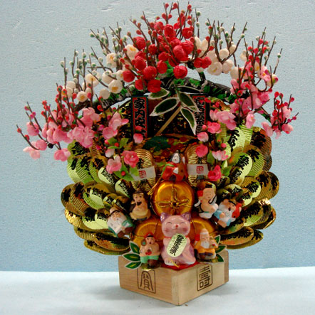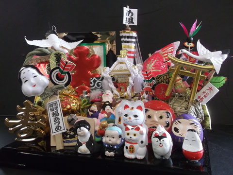 招福開運を招く七福神や小判、招き猫にお福さん、松竹梅、二福枡などなど縁起かつぎのアイテム満載の縁起物商品です。御所車と枡飾りは各3サイズございます。